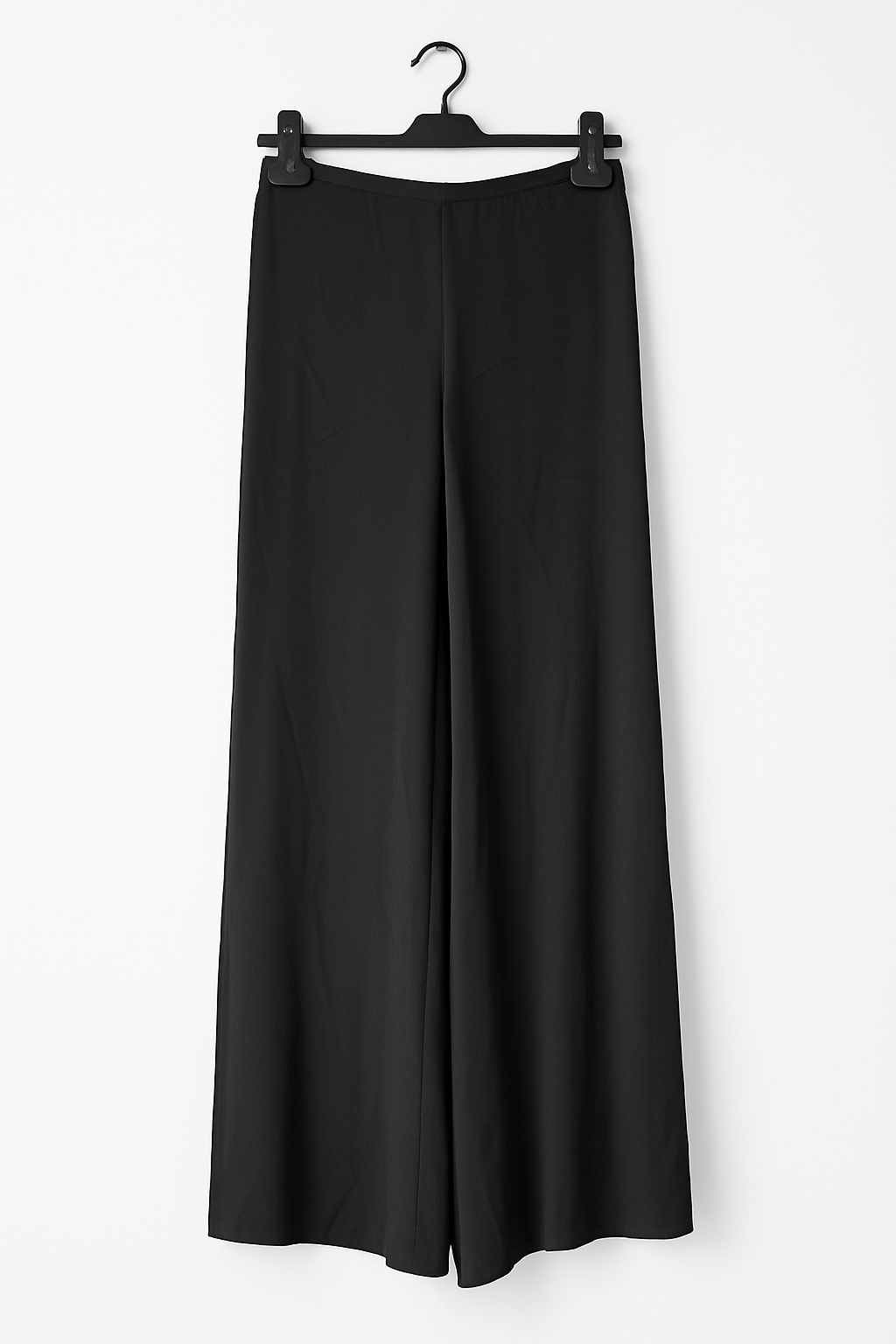 Elegante y versátil, este pantalón palazzo en color negro está confeccionado en una tela ligera con una caída fluida que aporta movimiento y sofisticación. Su diseño de cintura alta y piernas anchas alarga visualmente la figura, ofreciendo una silueta estilizada. Ideal tanto para looks casuales como más formales, combina perfectamente con tops ajustados o blusas vaporosas.