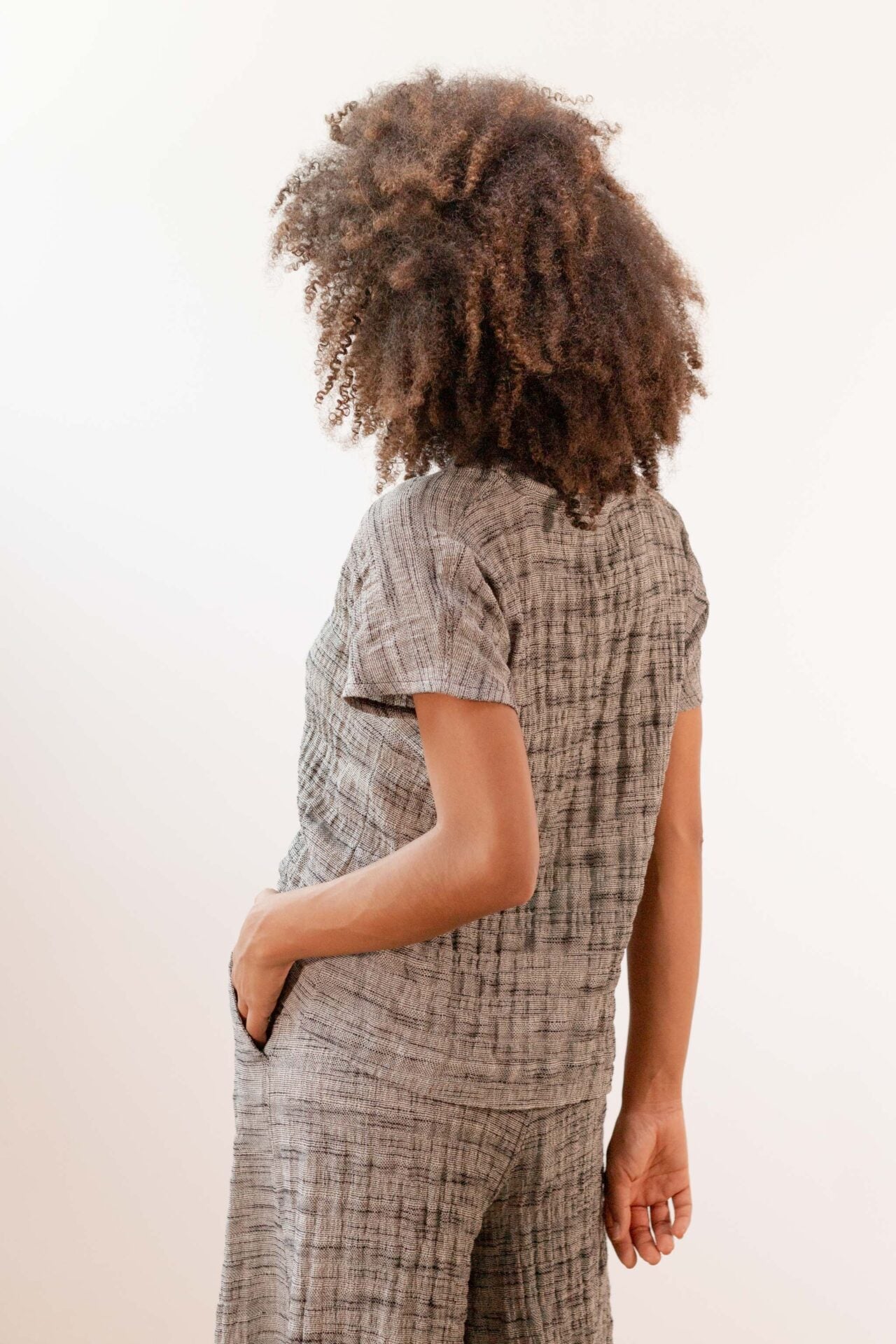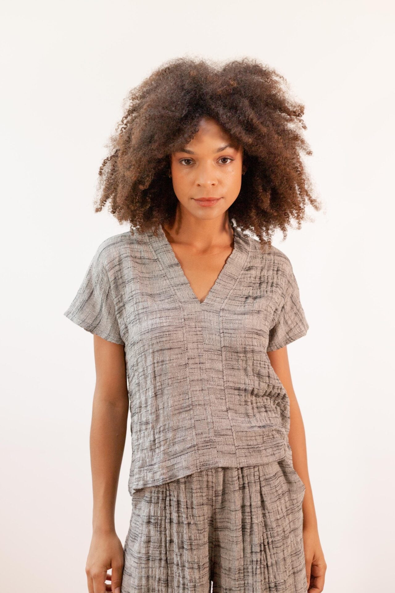Blusa de pico con hombro caído. Su tejido es jaspeado y hace efecto arrugado. Tiene un corte vertical que nace para hacer la forma del pico. Tejido con peso y caída