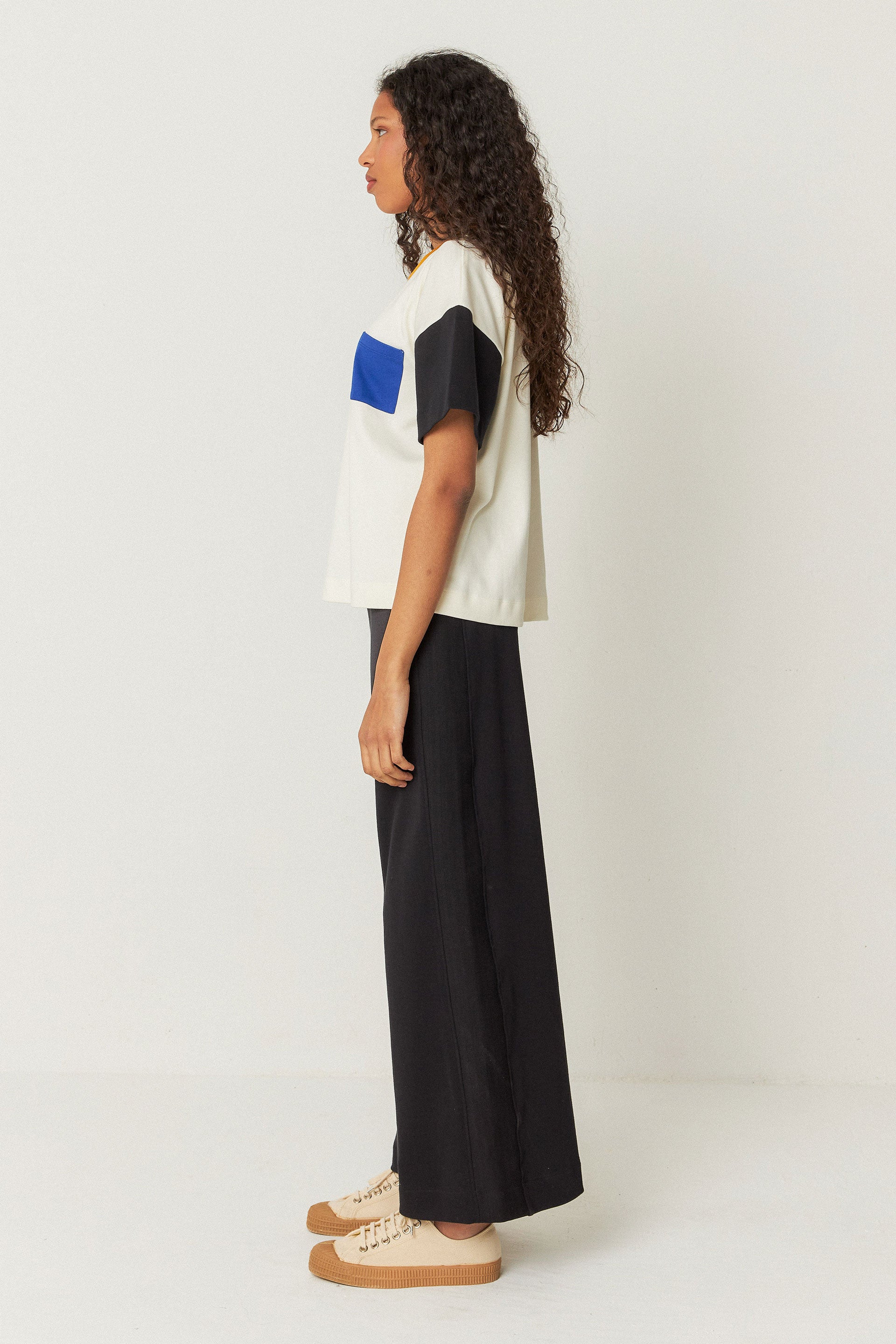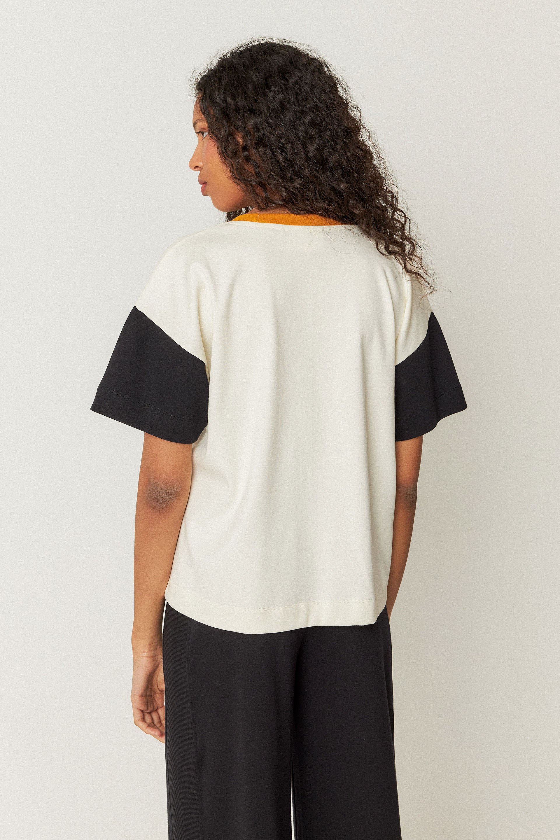 Camiseta holgada de manga corta y cuello redondo con parches de color en contraste.