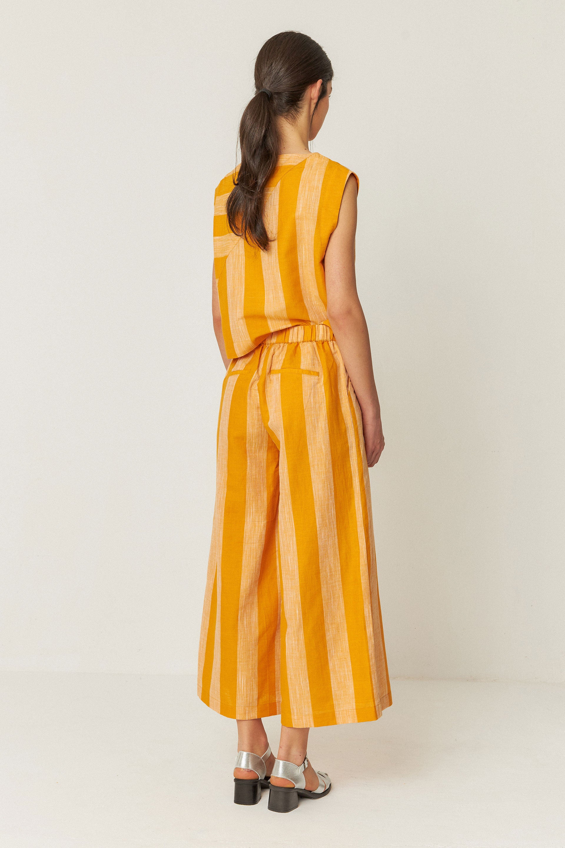 Pantalón palazzo con cinturilla elástica, cinturón anudado y bolsillos delanteros.