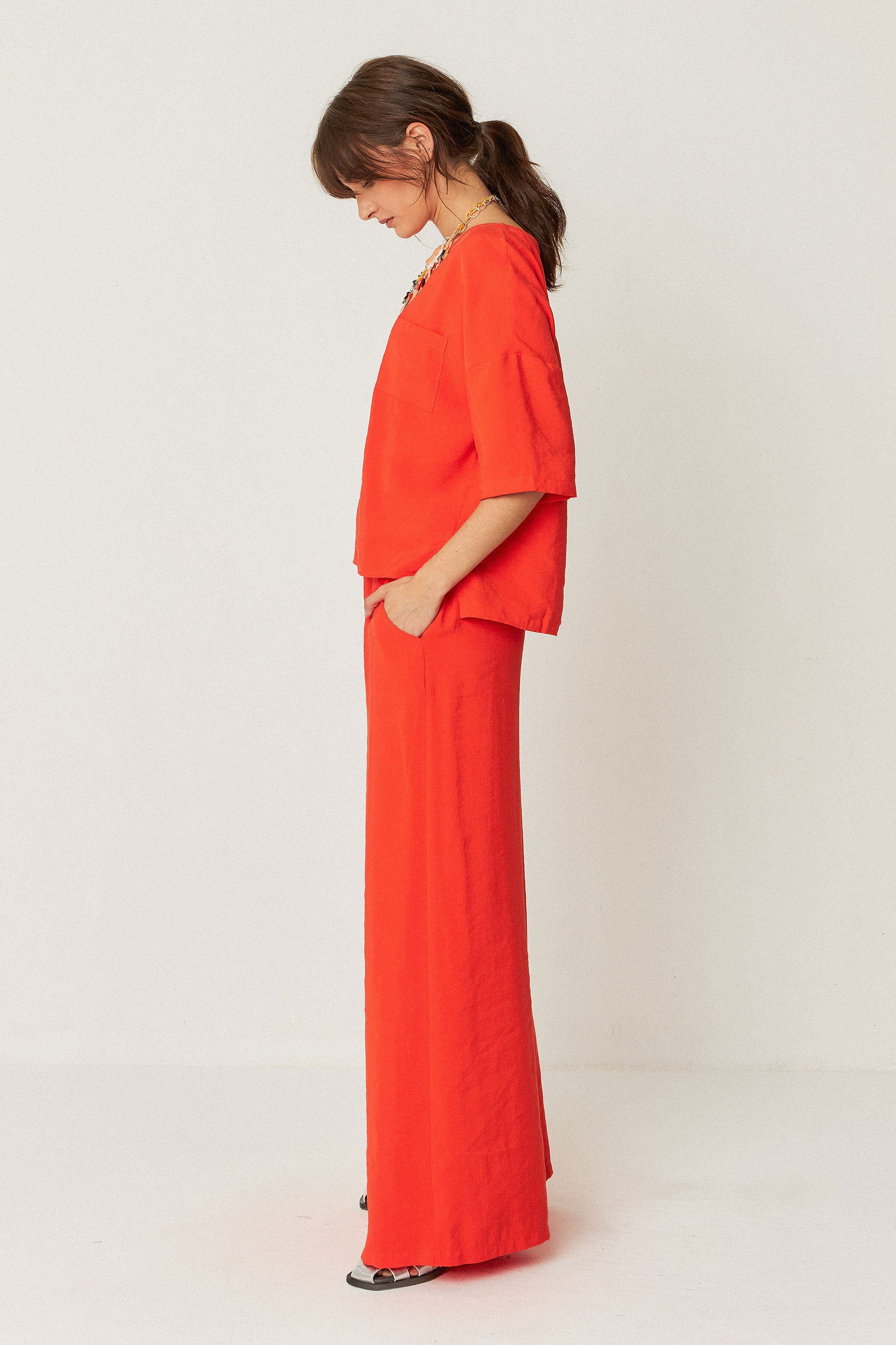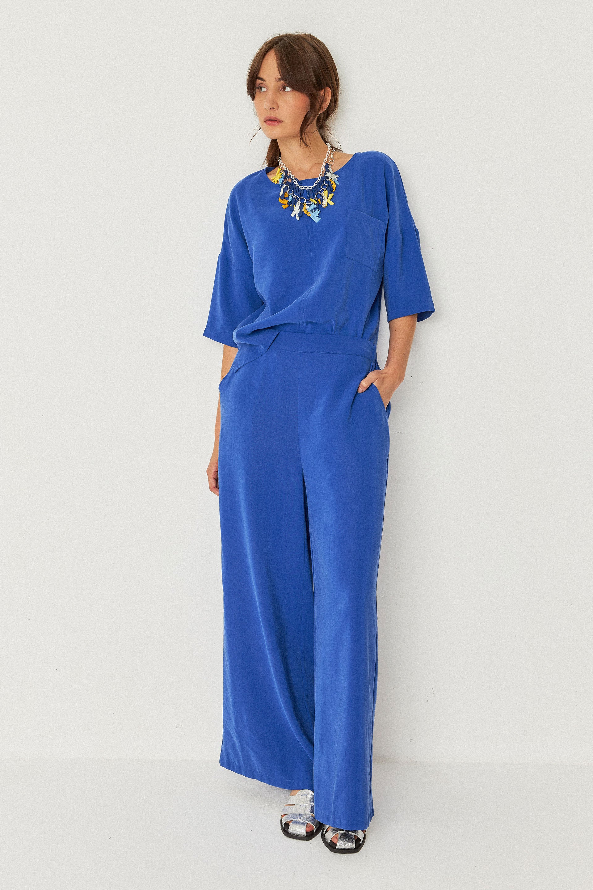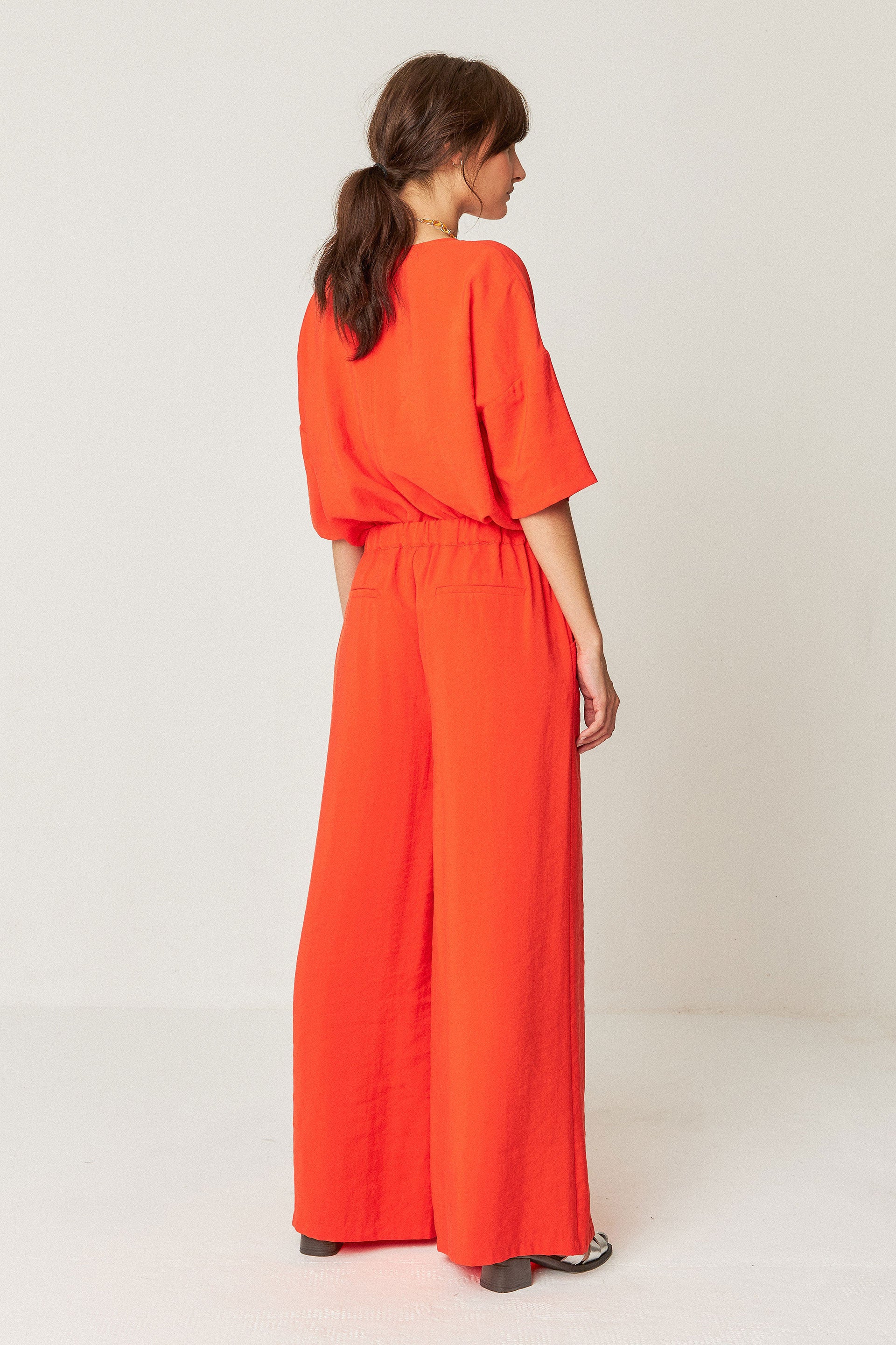 Pantalón palazzo con la cintura elástica por detrás y bolsillos laterales.