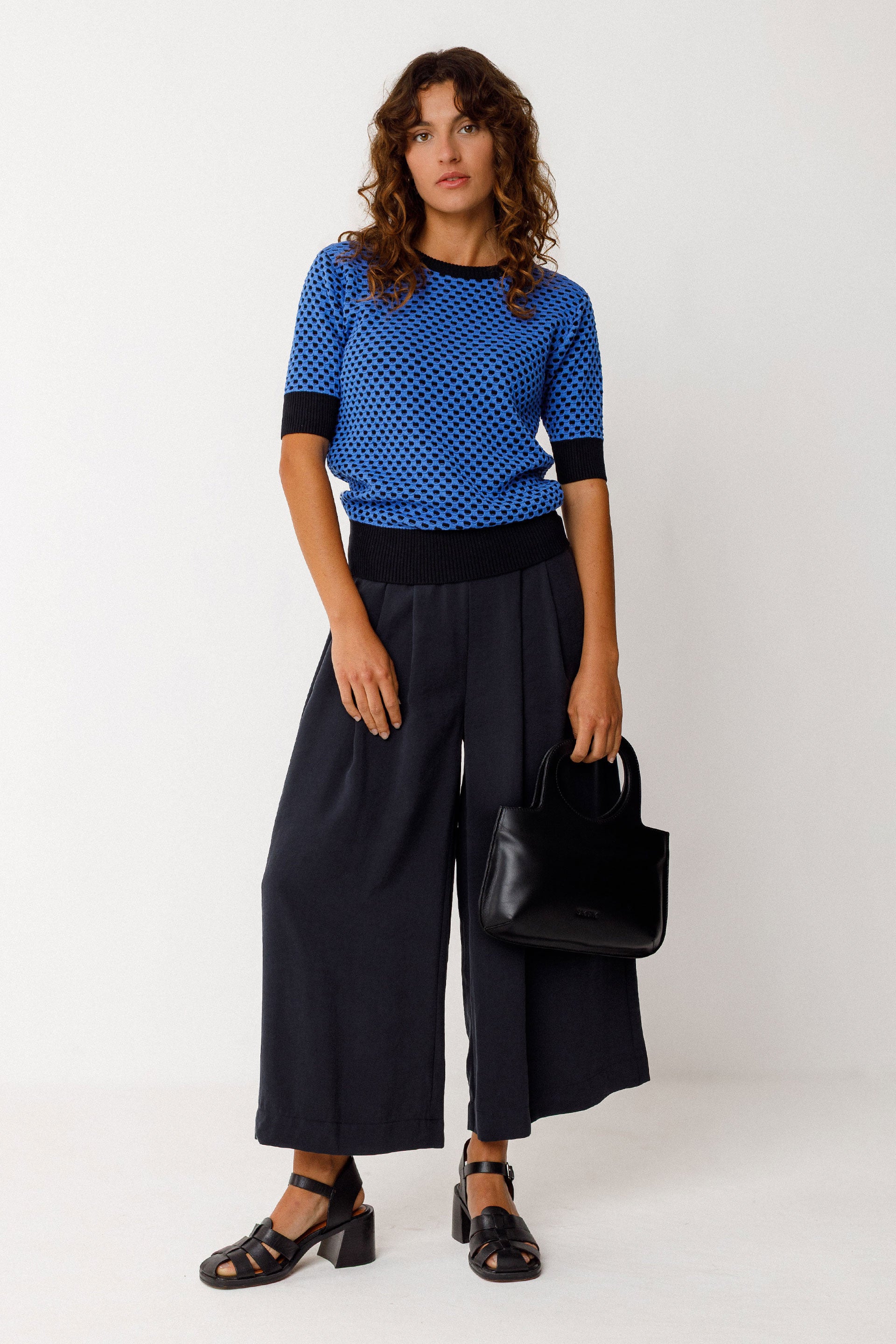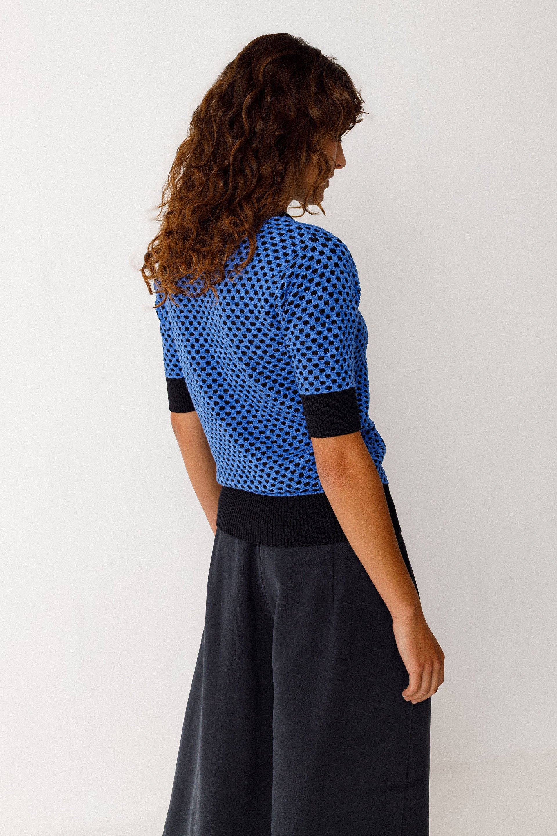 Suéter bicolor con efecto texturizado hecho de punto ligero de algodón orgánico con certificado GOTS. Tiene el cuello redondo, las mangas 3/4 y unos remates de canalé en el cuello, los puños de las mangas y la cintura.