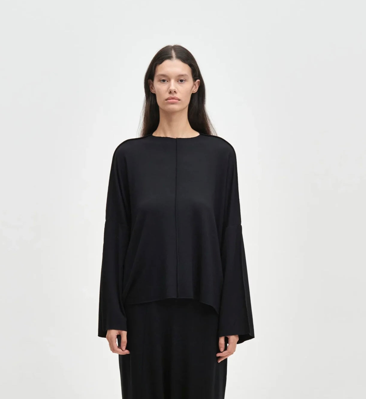 Camiseta con escote bote y costuras centrales verticales, corte holgado, confeccionado en tejido micromodal elástico. Fabricado en Grecia.