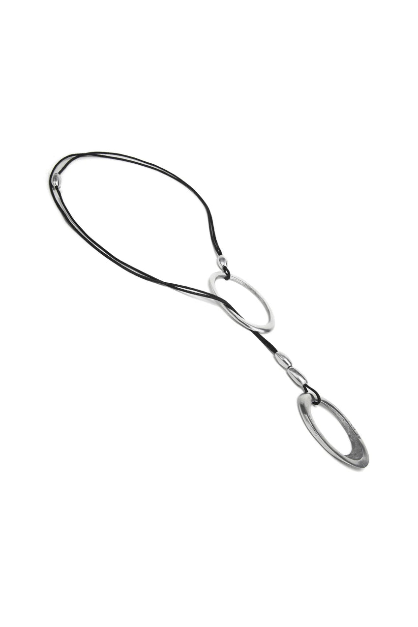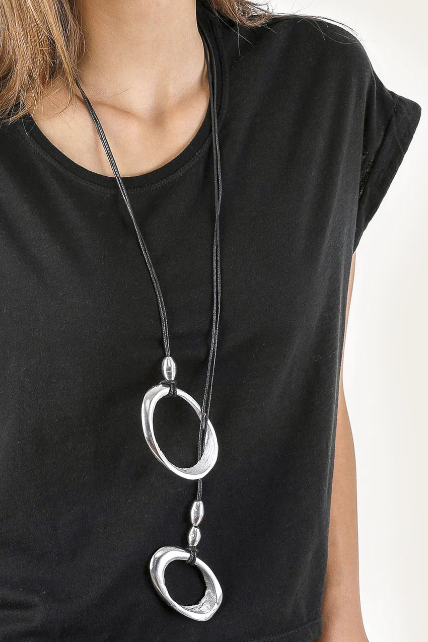 Collar de aluminio 100% reciclado con cordón negro, dos óvalos perforados y pequeños elementos en forma de aceituna. Diseño asimétrico tipo lariat. Ultraligero y cómodo para la piel. Sin níquel. Hecho a mano. Joyería única, elaborada artesanalmente, perfecta para cualquier ocasión o como regalo.