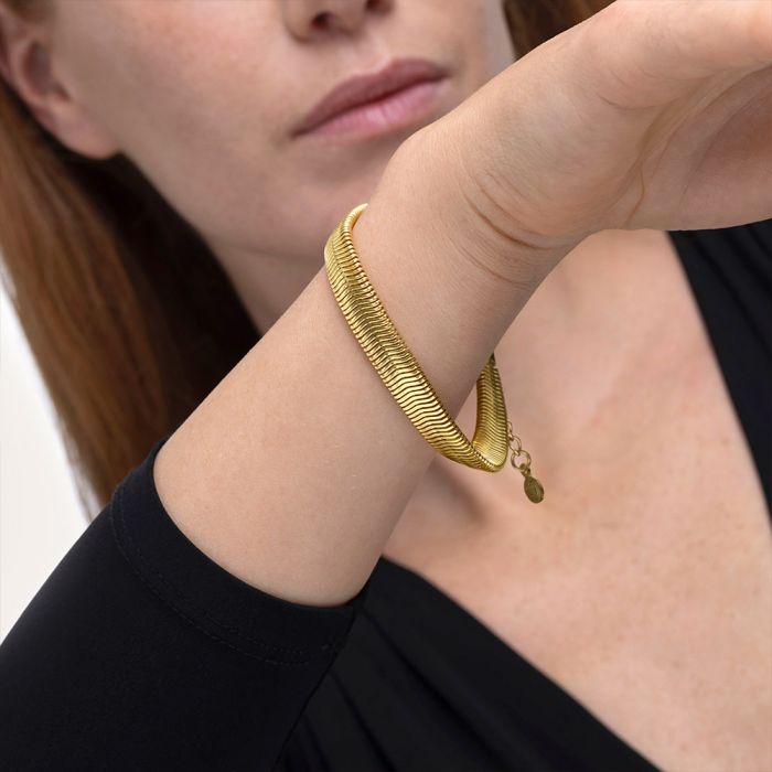 Pulsera de serpiente plana de latón. Modelo regulable. Cierre con mosquetón. Crea tu propia mezcla de pulseras combinando diferentes modelos, ligeros y cómodos de llevar. Longitud de la cadena: 18 cm. Longitud de la cadena extra: 5 cm. Producto sometido a pruebas de níquel. Joyas hechas a mano, únicas y artesanales, perfectas para todos tus looks o como idea para regalar.