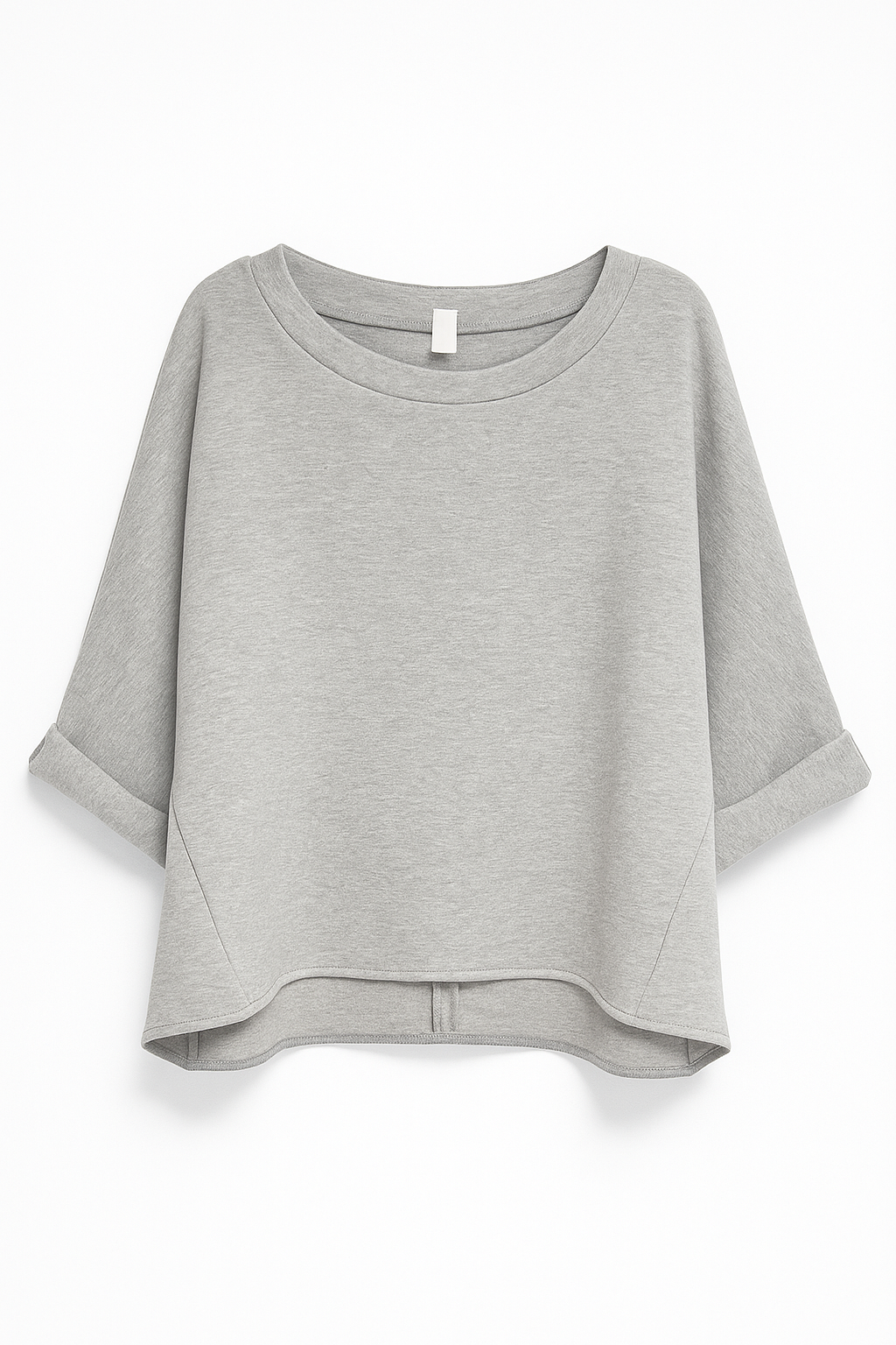 Buzo gris melange de corte amplio, con mangas 3/4 dobladas y terminación asimétrica. Prenda cómoda y versátil, ideal para un look casual y relajado.