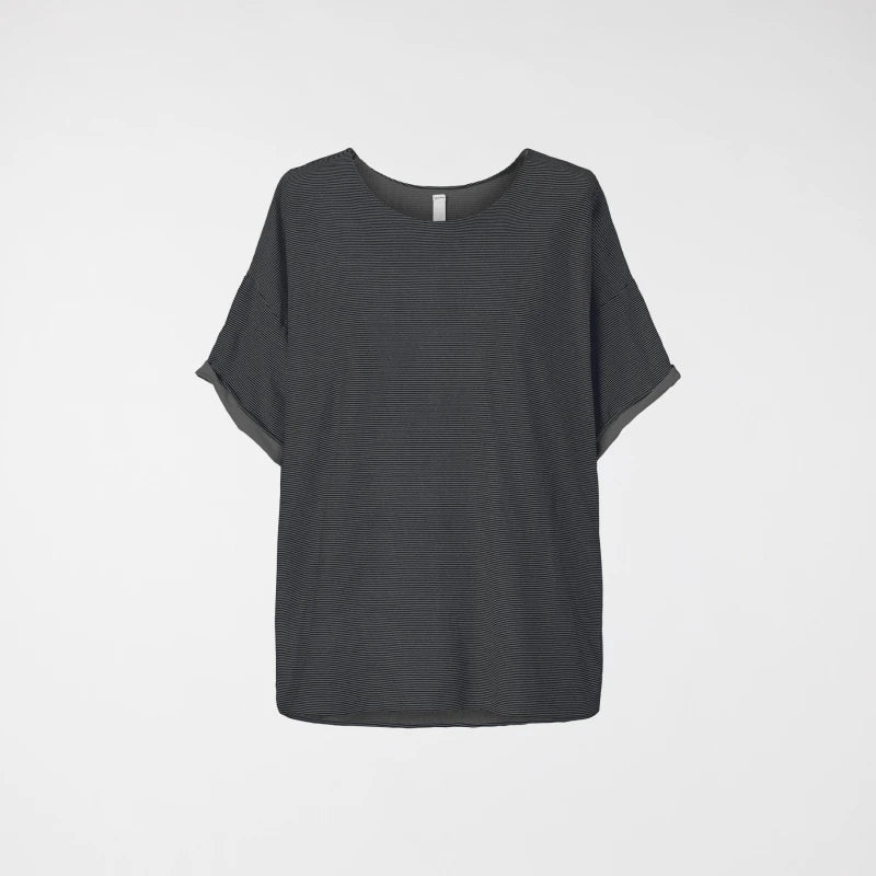 Camiseta de rayas finas de algodón. Escote redondo. Hombros caídos y mangas cortas. Dobladillos de corte vivo. Corte cuadrado. Ajuste amplio y cómodo.
