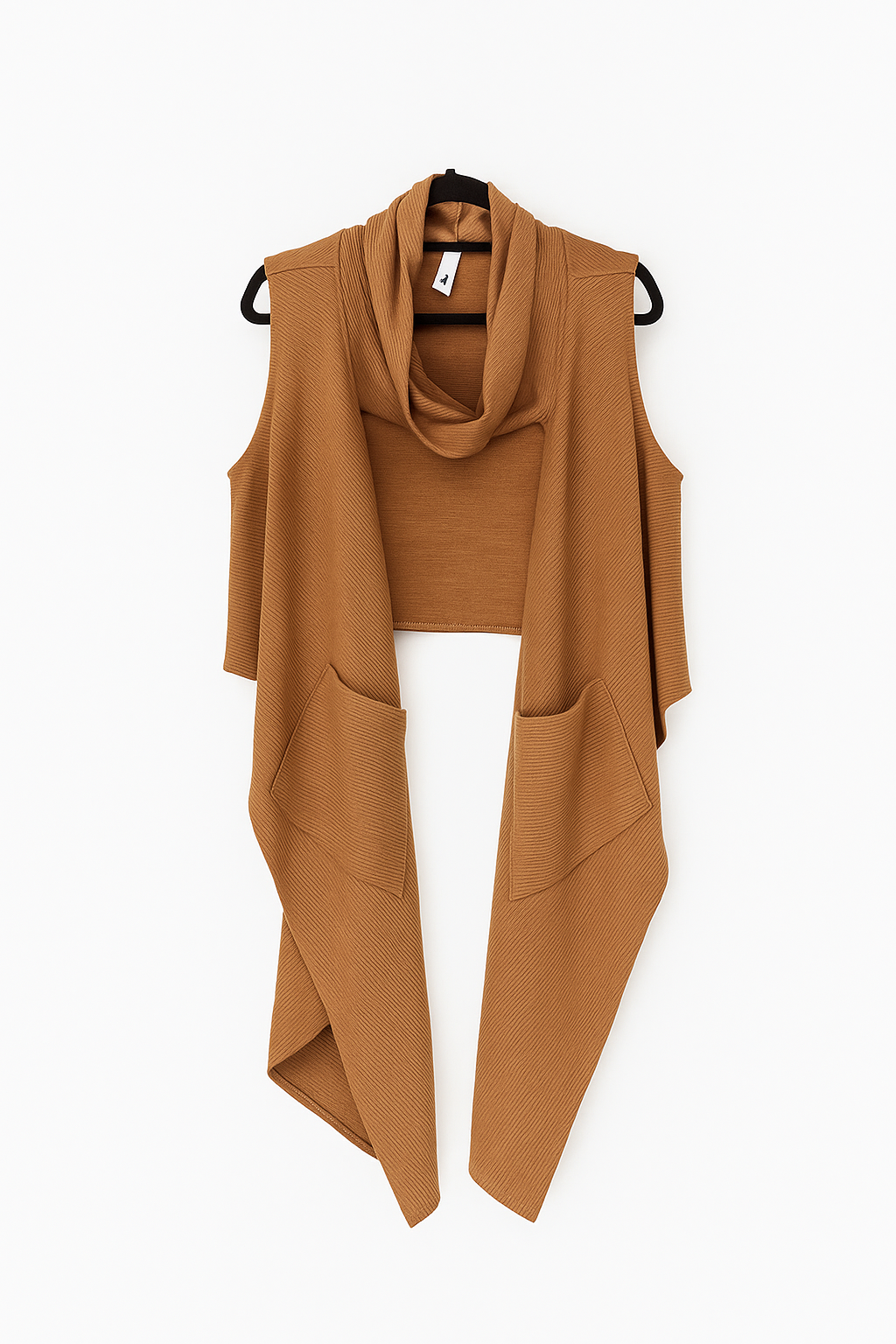 Chaleco largo sin mangas con cuello drapeado y bolsillos delanteros amplios. Su diseño abierto y fluido lo convierte en una prenda versátil, ideal para superponer sobre distintos looks y sumar estilo con comodidad.