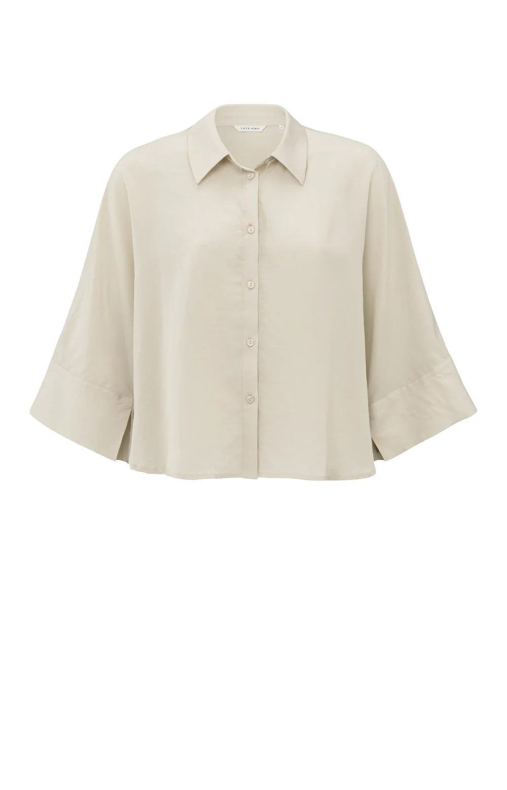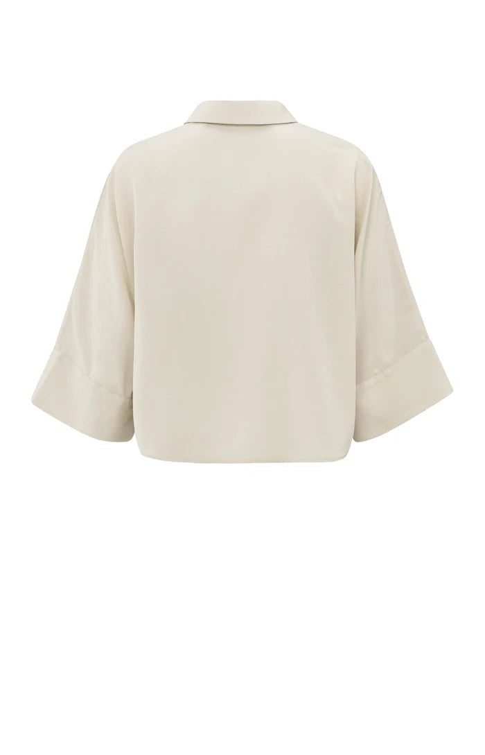 Esta blusa vaporosa presenta un corte holgado y corto, confeccionada en un tejido suave y fluido para un look cómodo. Presenta cuello clásico, cierre de botones y mangas tres cuartos con puños anchos. Perfecta para combinar con pantalones de cintura alta o una falda para un look elegante. La modelo mide 173 cm y usa la talla 36.